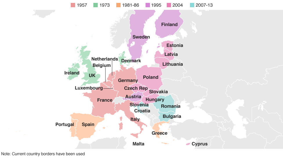 Seven years later a treaty signed in Rome created the European Economic Community (EEC) - the foundations of today's European Union. The UK was one of three new members to join in the first wave of expansion in 1973. Today the EU has 28 member states with a total population of more than 500 million.